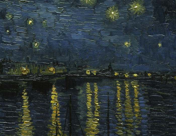 En ¨Noche estrellada sobre el Ródano¨, Vincent representó el cielo nocturno como una mezcla de colores sutiles y elegantes. En este cielo, las estrellas no dominan la escena con la intensidad de su obra posterior, sino que están tranquilas, brillando suavemente. El río refleja los tonos azules y amarillos de la noche, y las luces artificiales de la ciudad añaden un toque cálido al cuadro. Es una noche tranquila, en la que los reflejos del agua crean una atmósfera casi romántica.